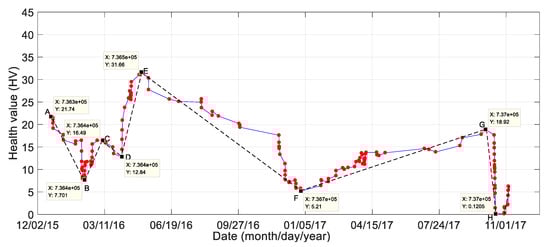 The result calculated using the PAM method is plotted, as shown in Figure 12. The red dotted line represents the HV curve. A larger HV value represents a greater deviation between the actual data and the baseline data. The two points are apart from each other with a large horizontal span, signaling a high possibility of downtime; alternatively, they might correspond to the RPOR data. The adjacent points are dense, indicating that sufficient data is available. Peak points are selected from the health value curve, labelled as Dates A–H, and they are connected using a dotted line. From Date A to Date B, the health value curve exhibits a declining trend, and from Date B to Date C, the health value curve trend is increasing. The reason was that, although the performance of the wind turbine naturally degrades as the service time increases, it can be improved through repair and maintenance. From Date C to Date H, an evident change similar to the former one is exhibited. The trend indicates that Date B and Date F do not correspond to the optimal operation state; instead, Date H has the smallest point on the curve as well as the point with the best performance point. This analysis indicates that the variation trend of the health value obtained using the PAM method is consistent with the theoretical performance change trend of repairable electromechanical equipment.