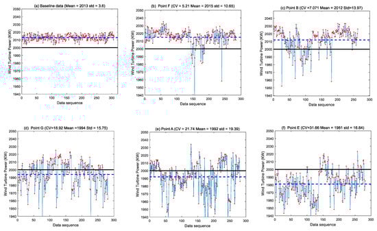 According to the research described in Section 2, the primary objective of the power curve in the MWPTR is to ensure stable operation of the wind turbine. The purpose of the PAM method is to analyze the deviation of the actual data and the baseline data. To prove whether the PAM method can efficiently calculate and describe the deviation between the two data, the mean value and variance of the baseline data at the extreme Points A, B, E, F, and G are calculated. The results are plotted in ascending order according to the HV values listed in Table 1, and the corresponding power sequence is plotted, as shown in Figure 13. Figure 13a shows that the mean value of the baseline data is 2013, the variance is 3.6, and the entire range of data points exhibits stable operation. Figure 13b shows that the HV value of node F is slightly lower than that in the baseline data, the variance is 10.65, and the values of some power points are less than 2000. B is the minimum point, slightly larger than F, with a HV value of 7.071, because its variance is larger than that of F. Figure 13c indicates that the number of points with a value lower than 2000 is smaller than that in Figure 13b. Points G, A and E are the maximum points because their mean values are smaller than the rated power and the baseline mean value, and they have large variance. The change trend can be determined from Figure 13d–f. The above analysis demonstrates that the HV value calculated using the PAM method can well reflect the deviation between the actual data and the baseline data, as well as the mean and variance of the dataset. In general, the PAM method can be an effective tool for calculating the performance change trend of wind turbines for predictive analysis.