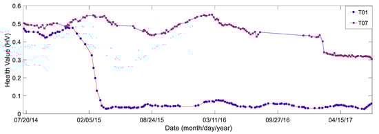 The long-term HV curves of multiple wind turbines can be determined using the PAM method, which can be used to monitor and optimize the performance of wind turbines. In Figure 14, two HV curves is shown to illustrate the performance change of the T01 and T04 wind turbines from July 2014 to 1 November 2017 by using the proposed method. It can be seen that the T01 wind turbine is never in the optimal state before March 2015; however, after repair in January 2015, the turbine shifted towards an optimal state. This change in the performance can be quantified in terms of the difference in HV. For example, the difference in the health value on two different dates is 0.4, which means that the deviation between the actual data and the baseline data reaches 40%. The HV curve of T07 indicates that this wind turbine undergoes notable performance fluctuations, which means that its deviation with the baseline data is large. The baseline data represents the optimal state of the T01 wind turbine in terms of the optimal operation state of the wind farm. After the wind turbine is repaired in March 2017, its performance improved and developed toward the optimal state. Thus, the proposed method can be effectively used to diagnose whether a given wind turbine operates in the optimal state or whether other wind turbines in the wind farm operate under optimal conditions.