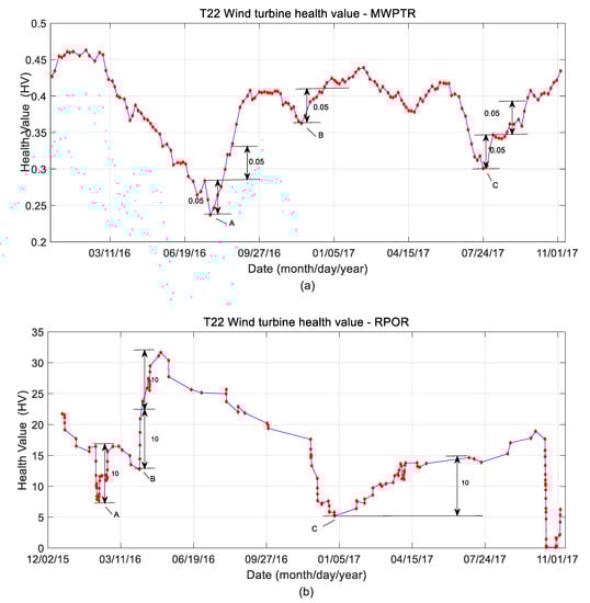 Condition pre-warnings are especially important for the operation and maintenance staff of in a wind farm. Using the PAM method, the T22 HV curves for the MWPTR and RPOR from 20 May 2015 to December 2017 were calculated. The HV in the MWPTR corresponds to the deviation of the actual measured data and the baseline data. Presuming a deviation of 0.05 is set as the alarm threshold, a point larger than the minimum points by 0.05 is selected as the pre-warning point. The HV curve and pre-warning line are plotted, as shown in Figure 15a, in which the minimum power point of the HV curve are marked as A, B and C. The growth rate of the HV curve after Date A is larger than 0.1. The HV of Date B is much larger than that for Date A, and the growth rate of the HV curve after date B exceeds 0.05. The HV of Date C is less than that of Date B but larger than that of Date A, of which the later growth rate exceeds 0.1. This analysis indicates that the HV curve of T22 changes considerably; in other words, the wind turbine performances are unstable. If the degradation trend after the minimum point is detected by the threshold line with HV equal to 0.05 and effective maintenance activities are carried out, a worsening in the degradation trend can be avoided. Similarly, when the minimum power point exceeds 0.1, the maintenance staff should focus extensively on investigating the reason.