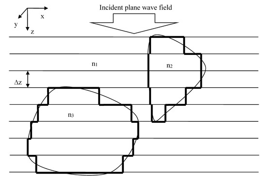 A plane wave falls on the structure under consideration (Figure 2) and is described by the expression where , —the boundary beginning of the probing area at the z-axis; —the wave number of the background medium; and is the frequency of probing signal.