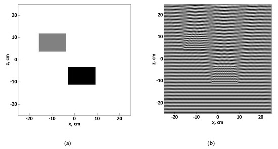 The result of modeling the field of diffraction of a plane wave on rectangular objects with a permittivity of 1.5 and 2 at a frequency of 20 GHz. (a) The given distribution of inhomogeneities with the gray rectangle showing a refractive index of 1.5 and the black rectangle, a refractive index of 2; (b) Field of diffraction.