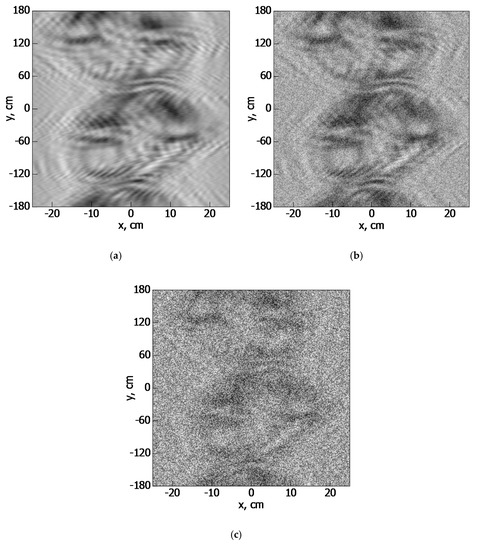 Note that the proposed method does not take into account the refraction of waves in dielectric objects and multiple reflections in the probed region. However, as shown by the results of the numerical experiments, this method is highly resistant to additive noise. Even when adding noise with a level of 100%, it is still possible to visualize objects in the study area.