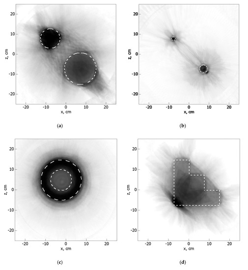In addition, numerical modeling was carried out for objects of various shapes. The results of image reconstruction using Equation (7) are shown in Figure 10. The dashed lines in Figure 8 show a simulated objects contour.