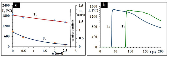 Combustion law for Ti + 2B + nSi system (a), and combustion thermograms of Ti + 2B + 2Si mixture (b) at P(Argon) = 1 MPa.