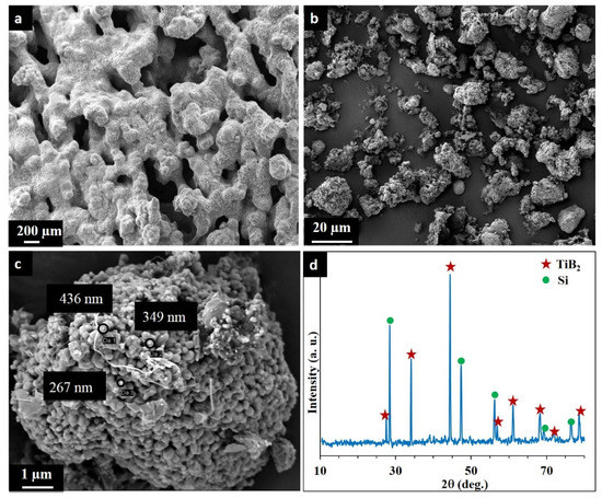 Morphology of the starting powders defines the degree of particles packing throughout the deposited layer. It is well-documented that spherical particles improve the flowability of powders and, therefore, highly affect the quality of the printed product. The SHS method utilized for the preparation of the TiB2-Si feedstock allows for the production of irregular-shaped particles with the required size. The “pomegranate-like” particle represents the collection of nano- and ultra-fine TiB2 particulates “gluing” together by silicon, as in Figure 2c. This kind of structure may positively contribute to the process of melting/solidification. During laser heating, the ceramic phase TiB2, which is tightly embedded in Si without formation of the chemical bonds, attains affinity to viscous silicon, thus promoting the sintering and compaction process. Figure 2d displays the XRD pattern of the powder revealing the presence of hexagonal titanium diboride (PDF#65-1073) and no spurious phase formation.