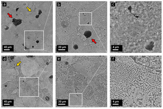 Top surface backscattered electron (BSE) images of TiB2-Si bulks printed by SLM at 1400 mA (a–c, Cylinder 1) and 1800 mA laser current (d–f, Cylinder 2). Cracks and pores are pointed out by yellow and red arrows, respectively.