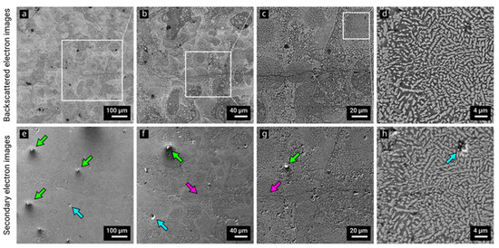 Top surface backscattered electron (a–d) and secondary electron (SE) images (e–h) of TiB2-Si bulks printed by SLM at 2200 mA laser current. Unmelted or partially melted particles are pointed out by green arrows; pores and surface defects are pointed out by blue and pink arrows, respectively.