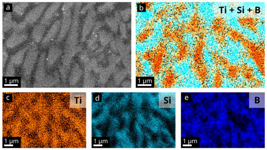 EDS mapping of 3D printed solid parts is shown in Figure 6. Figure 6b–e demonstrates the prevailing presence of Si and a minor concentration of Ti atoms (possible formation of TiSi or Ti5Si3 is not detectable by XRD) between TiB2 grains. The images indicate Ti and B atoms mostly located at the TiB2 sites.