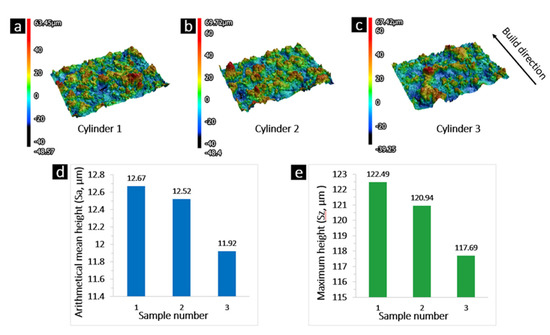 Surface profiles of Cylinders 1, 2, and 3 (a–c). Average arithmetical mean height (Sa) (d), and average maximum height (Sz), (e) for Cylinders 1, 2, and 3.