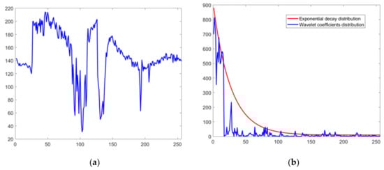 The sparsity of signals is directly related to the signal sampling compression rate (SCR) and the signal reconstruction quality. This wouldn’t mean that there must be K non-zero elements in sparse signals and all the remaining elements are 0 []. If all the coefficients of this signal were arranged from large to small in the sparse domain and the arranged coefficients were approximately an exponential decay distribution of approaching to zero, the signal would be also called an approximately sparse signal or a compressible signal []. DWT is usually used to compress signals, the coefficients distribution of non-sparse signals in DWT domain is very close to the exponential decay distribution, as shown in Figure 3. Figure 3a is a random non-sparse column signal of length 256, and the non-sparse column signal is transformed to the sparse coefficients distribution by DWT (the wavelet decomposition basis), as shown in the blue curve of Figure 3b. One can see that the wavelet transform can make the non-sparse signal become more sparse from Figure 3a to Figure 3b. As shown in the blue and red curves respectively of Figure 3b, the wavelet coefficients are gradually decreasing and are very close to the exponential decay distribution.