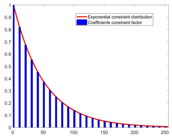 Based on the above analysis, we propose a new constraint condition of the positive exponential decay distribution of which the first term is 1, and this new constraint condition is applied to constrain the existing wavelet coefficients. The curve of this constraint function and the corresponding discrete histogram of this exponential decay are shown in Figure 4, in which the red solid curve is an exponential constraint distribution, and the blue columns are the constraint factors of wavelet coefficients of the corresponding sequence position. The constraint factors of blue columns are all positive real number less than 1 except the first term being 1. In other words, the wavelet coefficients are multiplied by the discrete exponential decay distribution with the first term being 1, and this constraint condition can make the wavelet coefficients distribution get more sparse and closer to the actual and real exponential decay.