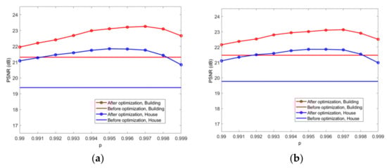 In order to test the performance of our proposed algorithm of optimizing traditional binary sensing matrix and get the empirical values of parameters in Section 3.4, we also conducted simulation experiments of reconstructing images Building and House by using our optimized binary measurement matrices. After testing some values, we found empirically that these parameters perform relatively well that , , , and in the loss Equation (15). DWT matrix was used as the known decomposition basis in our experiments. Table 2 is the experiments’ statistic results of reconstructing images Building and House before and after optimizing the binary sensing matrices with m = 64 and n = 256.