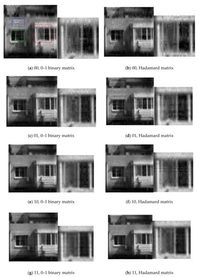 According to the evaluation index of Equation (33), we obtained the statistic SNRs table of Figure 8a–d and Figure 9a–d, as shown in Table 1. In order to express each imaging method conveniently and concisely, we used the “00” “01” “10” “11” to denote the four different imaging methods. From Table 1, one can know that, whether for the 0–1 binary matrix or the part Hadamard matrix, the SNRs of reconstructed images for both two imaging scenes have been very evidently improved after our method optimizing wavelet decomposition basis, as shown by the bold in Table 1. Therefore, the data results of Table 1 quantitatively demonstrate the superiority and effectiveness of our proposed DWT optimization method.