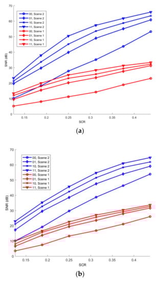 The evolution relationship between the imaging SNRs of reconstructed scenes and different compression sampling rates (SCR) for (a) 0–1 binary sensing matrix and (b) part Hadamard binary sensing matrix (“00” denotes the traditional imaging method before optimization; “01” denotes the imaging method after only optimizing wavelet decomposition basis; “10” denotes the imaging method after only optimizing binary sensing matrices; “11” denotes the imaging method after optimizing both wavelet decomposition basis and binary sensing matrices simultaneously).