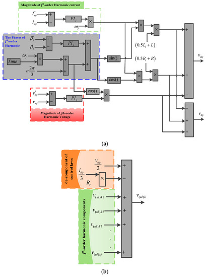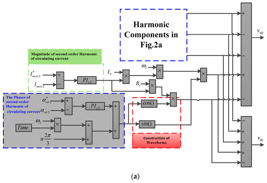 Based on the achieved control laws (14), the proposed control strategy under circulating currents with harmonic distortions is expressed by Figure 4. As can be seen from Figure 4a, the proposed control laws are highly affected by the various harmonic components of the circulating currents. Two additional kinds of PI controllers are employed in this part to provide more appropriate control in such operating conditions.
