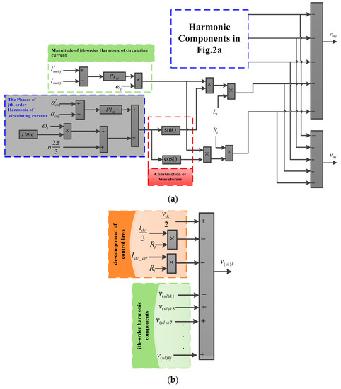 Proposed control strategy under zero circulating currents: (a) harmonic components of control laws and (b) the control laws.