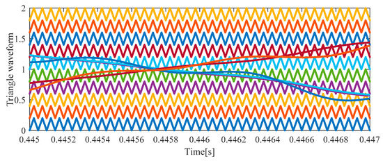 Figure 6 shows a 10-level shifted PWM used for the considered MMC with 10 SMs in each arm. Based on this figure, each triangle waveform is employed for its corresponding SM. By use of the 10-level triangle waveforms given in Figure 6, the SLPWM strategy was applied to the first and second control laws of phase “a” in Figure 5a,b, respectively. In comparison with the switching signals of the first control laws in Figure 7a, more switching operations are executed by the second control-law-based SLPWM, as depicted in Figure 7b. More switching operations causes greater switching losses. Thus, if a second-order harmonic component exists in the MMC circulating currents, the MMC switching losses are noticeably increased.