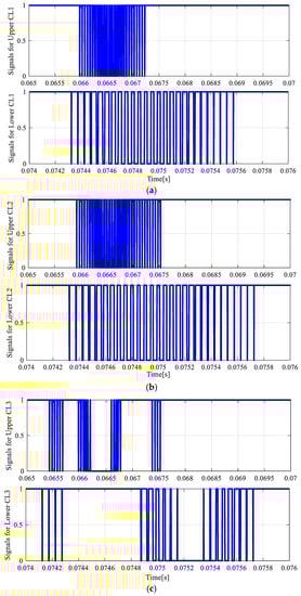 To further assess the switching signals, a distributed pattern of switching signals was driven by the third control-law-based SLPWM, as demonstrated by Figure 7c. In comparison with the switching signals of the first control laws in Figure 7a, inappropriate switching signals were achieved by the third control laws, as shown in Figure 7c. Furthermore, due to the over-modulation condition caused by the harmonic components of circulating currents, the third control laws cannot provide accurate switching signals in a certain operating period.