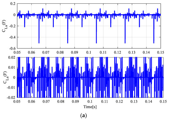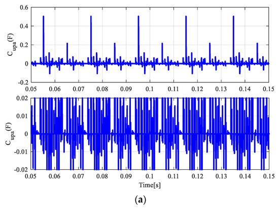 Departing from magnitudes between 0.3 F and −0.2 F, several fluctuations with high magnitudes −1.6 F and 1.5 F appear in the lower equivalent capacitor due to the third proposed controller, as shown in Figure 9c. It can be concluded from this discussion that the elimination of harmonic components causes the MMC to require smaller SM equivalent capacitors in order to reach the desired state variables.