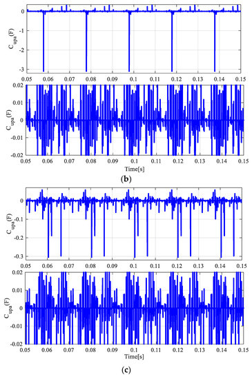 Equivalent capacitors for the upper arm of phase “a”: (a) first controller, (b) second controller, and (c) third controller.