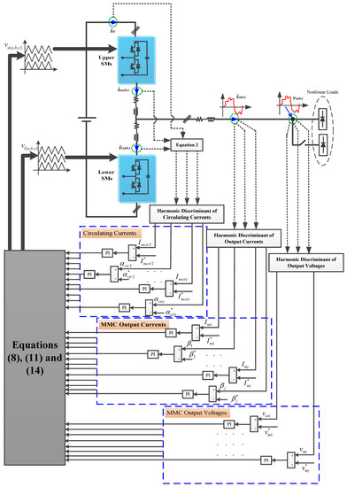 The proposed control strategy under circulating currents with a dc component and second-order harmonic is illustrated in Figure 3. As can be deduced from this figure, the harmonic components of the designed control technique are divided in two parts. The first part belongs to the same harmonic components as those due to zero circulating currents. In this part, the MMC output currents and voltages cause these harmonic components.