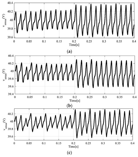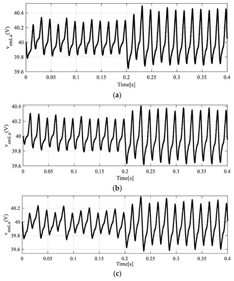 In this subsection, the upper and lower SM voltages and the output voltages due to the three proposed control strategies in phase “a” are evaluated. Figure 11 exhibits the upper SM capacitor voltages of phase “a” for the three proposed controllers.