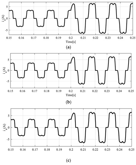 As seen in Figure 15a, the circulating current of the first controller was more than 4 times the third controller’s circulating current. On the other hand, this value deceased to more than double the third controller’s circulating current for the second controller, as shown in Figure 15b. Since the third proposed controller consists of the various harmonic components of circulating currents, this controller provides a better response for circulating currents compared with the other control strategies. The effects of decreasing circulating currents can be observed in Figure 16 and Figure 17.