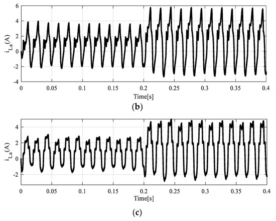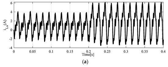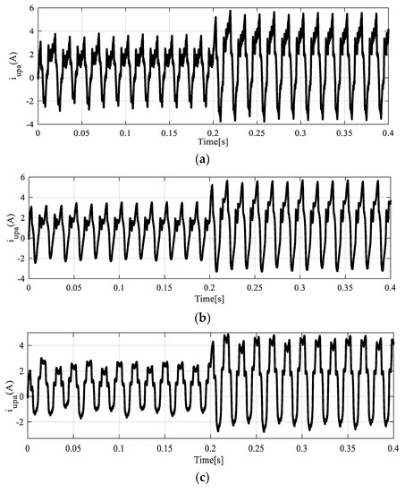 All figures were obtained without the harmonic compensation. Under zero circulating currents, the proposed control laws of phase “a” are shown in Figure 5a. Since the magnitude of the second-order harmonic of circulating current used for drawing Figure 5b is considered small, the two figures of Figure 5a,b seem to be the same. As can be seen from this figure, the harmonic components of the output currents and voltages cause the control laws to have waveforms with greater nonlinearity. On the other hand, the harmonic components due to the circulating currents generate control laws with more distortions, as shown in Figure 5c. In addition, the existence of the harmonic components in the circulating currents can raise the magnitude of the control laws by more than 2, leading to SLPWM with over-modulation, as depicted in Figure 5c. Also, according to this figure, a negative magnitude is achieved for the third upper control laws. From Figure 5a,b, it seems that both the first and second control laws have similar waveforms. In practice, the effect of the second-order harmonic component of the circulating currents can be realized by making a comparison between the switching signals.