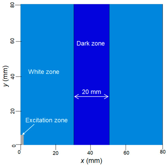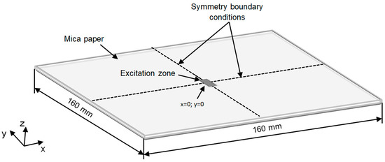 Propagation of the guided subsonic A0 mode in the mica paper sample was simulated by the Abaqus/CAE 2016.HF2 software package (Dassault Systemes, Johnston, Rhode Island, United States). Dimensions of the mica sample were 160 × 160 mm. For reduction of the computational time, only a quarter of the paper with symmetry boundary conditions was modelled. The modelled structure is presented in Figure 1.
