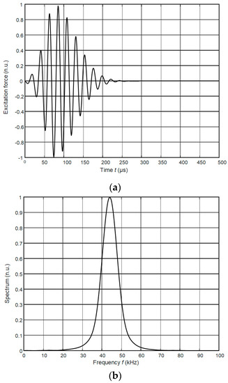 The simulation step in the time domain was dt = 1 μs. The excitation was applied at a rectangular zone 5 × 1 mm2, the centre of which was at x = 0, y = 0. The excitation was introduced as the uniformly distributed 1 N 44 kHz force impulse in the transmitter area. The frequency of 44 kHz was selected because at such a frequency only the slow A0 mode may propagate. The waveform and the spectrum of the excitation force are shown in Figure 2a,b.