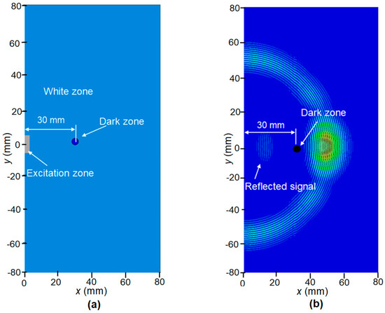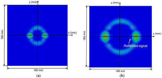 The diameter of this non-uniformity is 2 mm, e.g., comparable with the wavelength λ = (2 − 2.5) mm of the A0 mode in the mica paper sample. The elastic parameters and thickness are the same as in the case of the previous rectangular non-uniformity. The simulated spatial distribution of the of-plane displacements of the mica paper at the instant t = 225 μs is shown in Figure 10b. In the presented spatial distribution it is possible to see the ultrasonic signal reflected by the circular non-uniformity and propagating in a backward direction. The B-scan obtained along the line y = 0 mm crossing the centre of the circular non-uniformity is presented in Figure 11a.