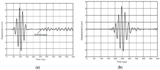 Ultrasonic pulses at two different distances from the 1 × 5 mm2 excitation zone: (a) 10 mm; (b) 40 mm.
