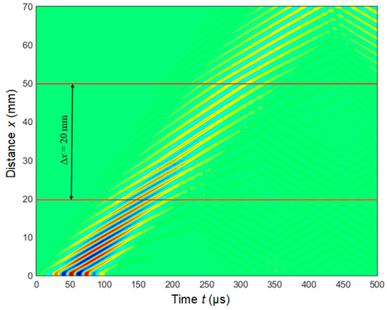 In the case of the air-coupled excitation in addition to those modes the wave propagating in air originates from the tip of the air-coupled transducer. In the 2D spatial–temporal spectrum the spatial frequencies in the range [0.05–0.1] mm−1 correspond to the wave propagating in air. The propagation paths of this wave are shown in Figure 20.