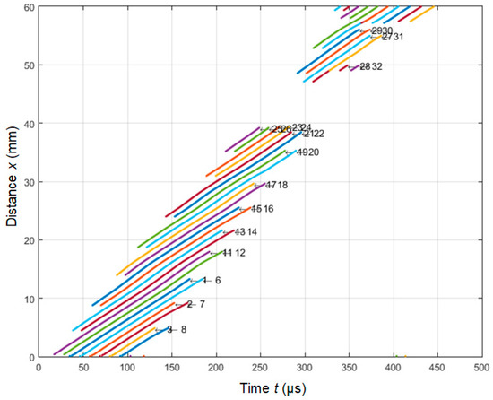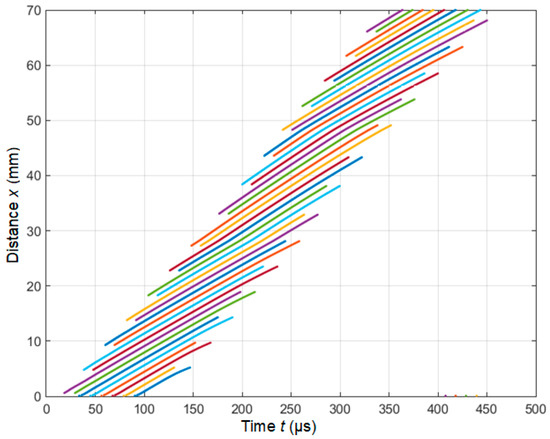 - The phase of the of guided waves signal is “moving” with respect to the envelop of the signals due difference of the phase and the group velocities. This is possible to see in the B-scan image. It may lead to the half-period errors in the selection of particular zero crossing point in two signals measured at neighbour positions. In order to avoid it, the estimated zero crossing time instants are sorted by following each particular zero crossing instant in the signals measured at different distances. The result is a new set , where are the new zero crossing time instants from the set ; is the distance at which the signals with particular the zero crossing time instant was measured; m = 1 ÷ M, M is the total number of the zero-crossing points followed up; l = 1 ÷ Lm, Lm is the number of positions of particular time instants followed up. The set obtained in the case of the mica paper sample with a rectangular area with different properties in the graphical form is presented in Figure 7. The lines of a different colours indicate the different zero-crossing points followed-up.