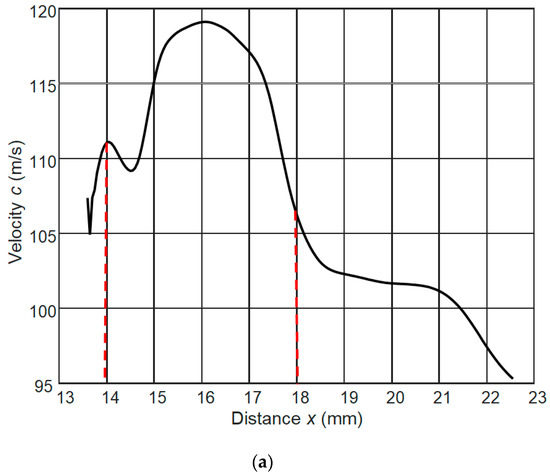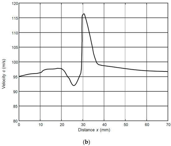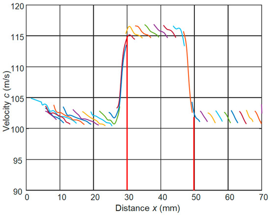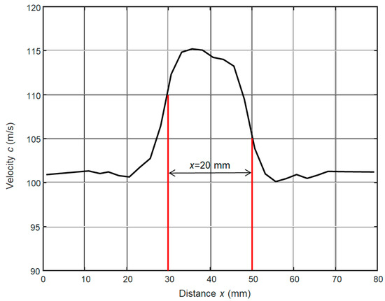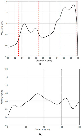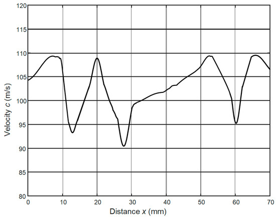 In Figure 16c the reconstructed phase velocity spatial distribution along the line y = 3 mm which crosses the region with a smaller number of spatial non-uniformities is given. It is possible to see that in this region variations of the phase velocity are smaller in the range 95–104 m/s.