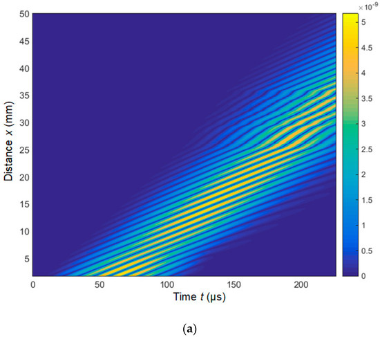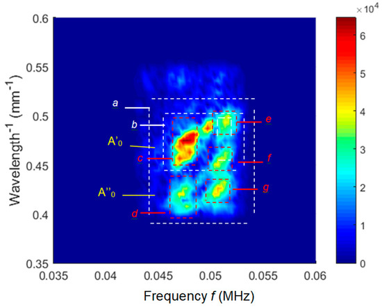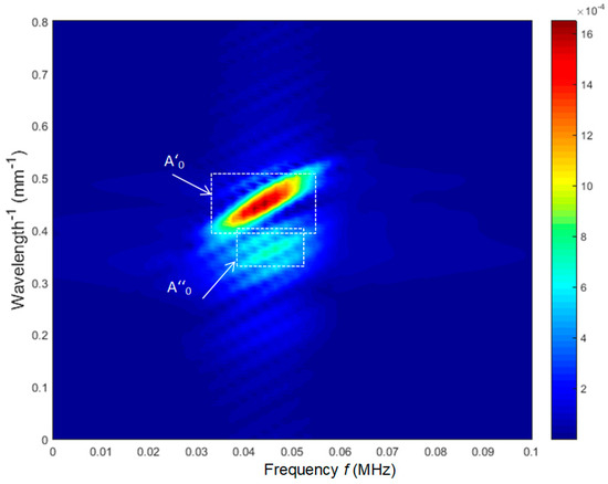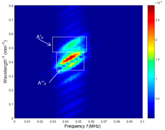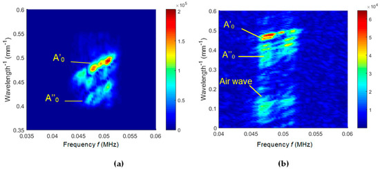 The 2D spectra of the B-scans obtained in the case of the contact and the air-coupled excitation are presented in Figure 22a,b.