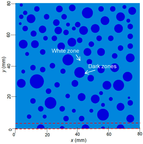 We then analyse the case with a large number of circular non-uniformities of different diameters (Figure 12). This case is closest to the spatial distribution of zones with other properties of a real experimental mica specimen shown in Figure 13. The diameters of circular non-uniformities in simulation were selected randomly in the range 2–5 mm.
