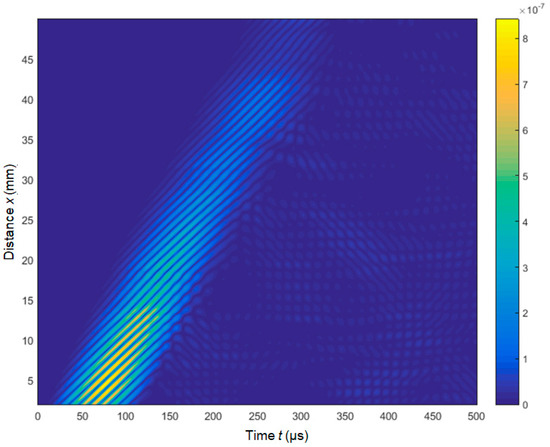 Experiments were performed on the mica A4 dimensions sample with the thickness 35 μm. The sample together with the contact PMN-32%PT strip-like transducer was scanned with respect to the laser beam with a step of 0.1 mm. Interferometer averaging was set three times. The B-scans were collected in different areas of the sample in order to randomize the influence of the optically darker zones which possess very different acoustic properties. The length of the B-scans was 85 mm. The duration of ultrasonic pulse used for excitation of A0 mode was six periods, and the central frequency was 44 kHz. The example of the recorded raw B-scan in the case of the contact excitation is presented in Figure 21.