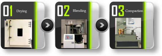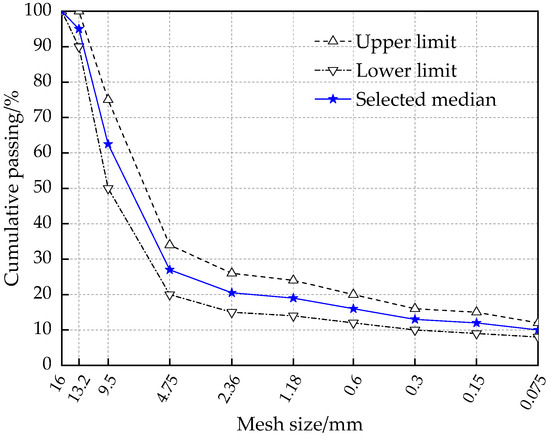 Stone mastic asphalt (SMA) is a commonly used asphalt mixture type in China, and SMA is extensively adopted for highways. Following the Chinese specification JTG E20-2011 [34], the median gradation of SMA-13 was selected, in this study. The corresponding gradation curve is plotted in Figure 1. The SMA-13 specimens were designed and prepared using the superpave gyratory compaction (SGC) method, and the detailed procedure can be investigated in the previous study [35]. The bitumen percentage was 5.7% by weight of aggregates and the basalt fiber content was 0.34% by mass of SBS-modified asphalt. For the SGC parameters, the number of gyrations was set as 100 under the pressure of 600 kPa and gyration angle of 1.25°. In this study, the procedure of the SMA-13 specimen by the SGC method is shown in Figure 2, which generally consisted of three basic steps.