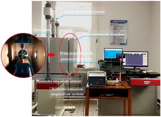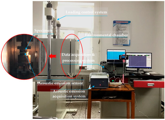 In this paper, an electro-hydraulic servo pressure material testing machine (Jinli Test Technology Co., Ltd., China) was selected to perform the uniaxial compression test at 50 °C for basalt fiber-modified asphalt mixtures subjected to F-T cycles. Figure 3 illustrates the scene of the uniaxial compression test combined with the AE test. The testing system included a loading control system, a data acquisition and processing system, an environmental chamber, and so on. The AE system with six channels consisted of one AE sensor attached on the asphalt mixture specimen with a kind of sound-transmitting coupling agent, preamplifier, as well as an acquisition and data analysis system. For the purpose of obtaining the stress–strain relationship curve of the asphalt mixture specimens, the displacement control during compression was used for loading at a constant strain rate. Before the tests, asphalt mixture specimens were kept in an environmental chamber at 50 ± 0.5 °C for more than 4 h to ensure uniform temperature distribution inside the specimens, and the test loading rate was set to 1 mm/min. Following the specification JTG E20-2011 [34], the compressive strength, failure strain, and compression failure stiffness modulus were calculated using the following equations, respectively.