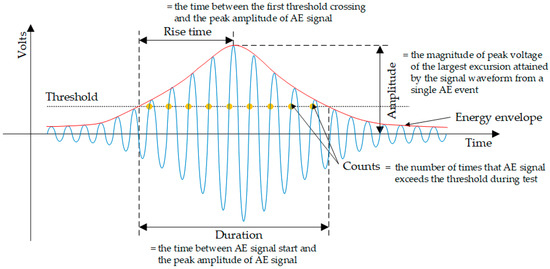 The commonly used AE parameters are signal amplitude, count, duration, energy, rise time, and so on. The characteristic parameters of AE signals are shown in Figure 5. According to previous studies, signal amplitude and count can effectively characterize the fracture performance of bituminous mixtures [28,29]. In this study, the AE signal amplitude and count parameters were also selected to characterize the fracture damage characteristics of basalt fiber-modified asphalt mixture under various F-T cycles. As can be seen from Figure 5, the signal amplitude represents the maximum volt of the AE signal, and the signal count is the cumulative number of times that the AE signal strength is greater than the threshold point. Then, these two parameters (i.e., amplitude and count) can usually reflect the signal strength during the AE test.