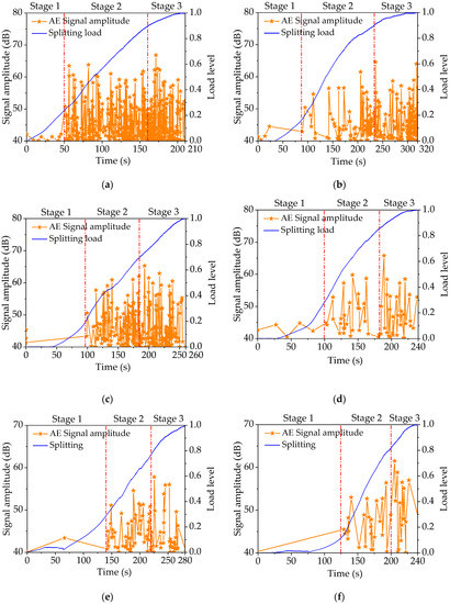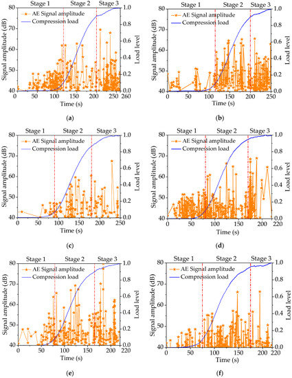 For the purpose of analyzing the effects of F-T cycles on the compression fracture damage, the relationships between signal amplitude and load level versus time during compression were obtained for the SBS-modified asphalt mixtures with basalt fiber under various F-T cycles. The load level was determined by the ratio of applied load and failure load. As shown in Figure 6a, the entire loading process and the AE signal amplitude can be divided into three stages by combining the intensity of the AE signal amplitude and the load level. At the first stage, the lower AE signal amplitude values, ranging from 40 to 50 dB, were generated and recorded during compression loading, while the load level was below 0.1. The lower AE signal amplitude values in the first stage, were considered to be the signal due to the mechanical noise during loading. Then, several microcracks were preliminarily formed under compression loading during the first stage. After entering the second stage, a significant increase of the AE signal amplitude began to appear, ranging from 50 to 70 dB when the load level was between 0.1 and 0.9. The AE signal amplitude values increased with increasing load levels. The increasing AE signal amplitude implies that cracks were formed at this stage and the cracks also developed into stable crack growth. As the compression loading continued, the AE signal reached the third stage. During this stage, the highest value of the AE signal amplitude occurred, which means that the cracks in the asphalt mixture specimen developed rapidly. Meanwhile, the AE signal amplitude showed a trend of slow decline after reaching the maximum value as the compression loading continued. This is because macroscopic cracks occurred when the damage accumulated to a certain degree, and eventually the asphalt mixture specimen was destroyed.
