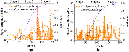 The AE amplitude and load level versus time during compression at 50 °C for SBS-modified asphalt mixture with basalt fiber under various freeze-thaw (F-T) cycles. (a) 0 F-T cycle; (b) 3 F-T cycles; (c) 6 F-T cycles; (d) 9 F-T cycles; (e) 12 F-T cycles; (f) 15 F-T cycles; (g) 18 F-T cycles; and (h) 21 F-T cycles.
