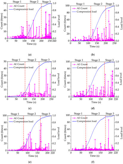 For the purpose of analyzing the effects of F-T cycles on the compression fracture damage, the evolutions between signal count and load level versus time during compression were obtained for the SBS-modified asphalt mixtures with basalt fiber under various F-T cycles. As shown in Figure 7a, the entire loading process and AE signal count can be divided into three stages by combining the intensity of the AE signal count and the load level. At the first stage, during the compression loading with load level below 0.1, there were almost no AE signal counts generated except several AE counts due to the mechanical noise while loading. After entering the second stage, the AE signal started to come alive. A significant increase in the AE signal count began to appear when the load level was between 0.1 and 0.9. The AE signal count values increased as the load level increased. The increasing AE signal count implies that cracks occurred gradually and preliminarily formed at this stage, then, cracks also developed into stable crack growth under continuous compression loading. As the compression loading continued, the AE signal reached the third stage. During this stage, the highest value of the AE signal count occurred, which means that the cracks in the asphalt mixture specimen developed rapidly. The AE signal count increased significantly, which means obvious cracks appeared inside the specimen, eventually losing resistance and causing damage.