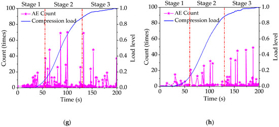 The AE count and load level versus time during compression at 50 °C for SBS-modified asphalt mixture with basalt fiber under various F-T cycles. (a) 0 F-T cycle; (b) 3 F-T cycles; (c) 6 F-T cycles; (d) 9 F-T cycles; (e) 12 F-T cycles; (f) 15 F-T cycles; (g) 18 F-T cycles; and (h) 21 F-T cycles.
