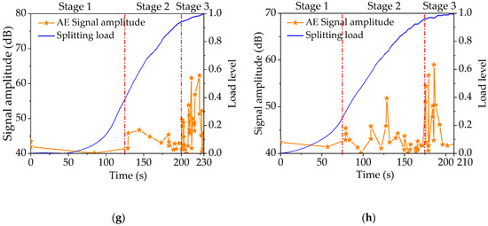 The AE amplitude and load level versus time during splitting at −10 °C for SBS-modified asphalt mixture with basalt fiber under various F-T cycles. (a) 0 F-T cycle; (b) 3 F-T cycles; (c) 6 F-T cycles; (d) 9 F-T cycles; (e) 12 F-T cycles; (f) 15 F-T cycles; (g) 18 F-T cycles; and (h) 21 F-T cycles.