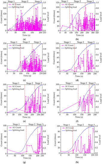 The AE count and load level versus time during splitting at −10 °C for SBS-modified asphalt mixture with basalt fiber under various F-T cycles. (a) 0 F-T cycle; (b) 3 F-T cycles; (c) 6 F-T cycles; (d) 9 F-T cycles; (e) 12 F-T cycles; (f) 15 F-T cycles; (g) 18 F-T cycles; and (h) 21 F-T cycles.