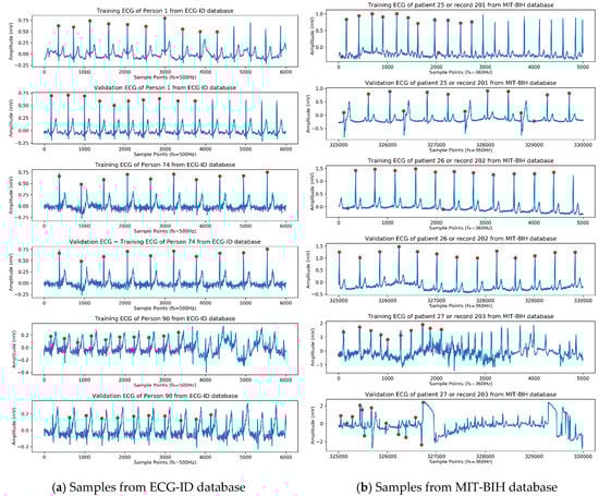 Using ECG-ID and MIT-BIH databases, the ECG record and its positions were obtained, as shown in Figure 2. For the ECG-ID database, three samples were taken from 90 people. The first record was used for training, while the second record was used for validation. There were ten annotated as shown in Figure 2 for each person. In the MIT-BIH database, records 201 and 202 belonged to the same patient with different ECG beats, so they were classified as two classes. The red dots in Figure 2 are an example of the position detected manually by cardiologists. Using this position, the ECG beat was detected and extracted. An example of ECG beat detection and segmentation for both databases is shown in Figure 3.
