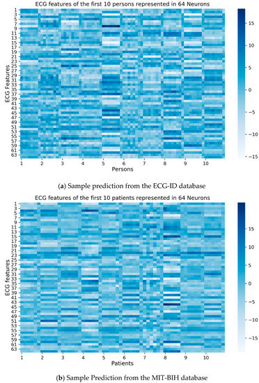 The summary of the authentication results of all validation beats can be seen in the confusion matrix shown in Figure 5. Figure 5a,b shows the confusion matrix of the authentication results for the 90 validation beats. These 90 beats were extracted from ECG records in the ECG-ID database. Each person is represented by eight beats or a total of 729 validation beats. Figure 5c,d is the confusion matrix of the authentication results for the 48 validation beats. These 48 patient beats were extracted from ECG records in the MIT-BIH database. Each patient is represented by six beats or a total of 288 validation beats.